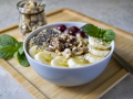 Разрежьте нектарины пополам и достаньте косточку. Положите в подходящую форму для запекания в аэрогриле срезом вверх.