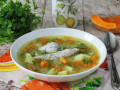 На днях я варила бульон из костей индейки, вот на нем и приготовила суп. Со скелета индейки сняла немного мяса, вышло совсем ничего, но на две порции супа как раз хватило.