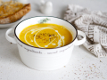 Подать тыквенный суп к столу в тыкве. Можно разлить его по чашкам, а потом сам горшочек разрезать на кусочки и подать с супом. Приятного аппетита!