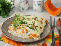 Куриная запеканка с сыром готова. Нарежьте её на порции и разложите по тарелкам. Подавать можно с любым гарниром или просто с овощным салатом.