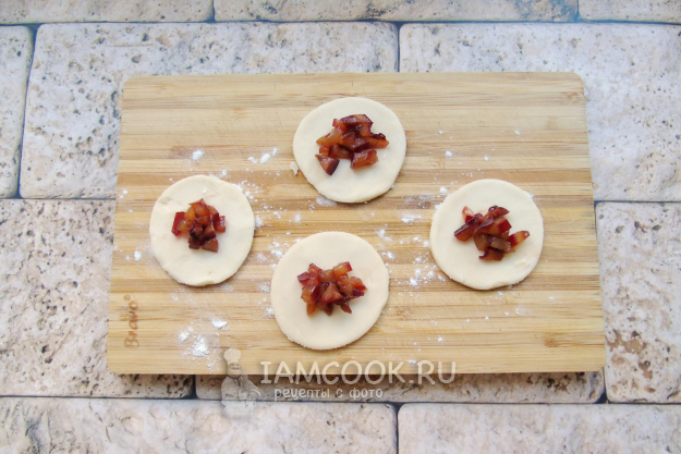 От теста отрежьте часть и раскатайте в пласт. С помощью вырезки нарежьте кружочки. В каждый кружок выложите начинку из слив.