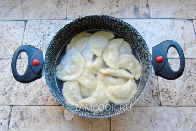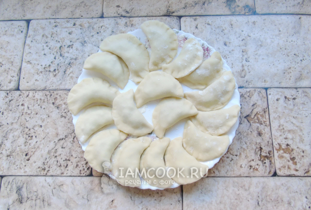 Слепите края кружка, формируя вареник. Так поступите со всем тестом. Выложите вареники на тарелку или доску, присыпанную мукой.