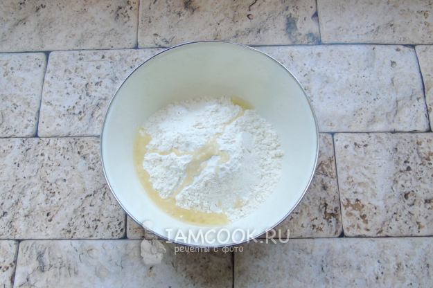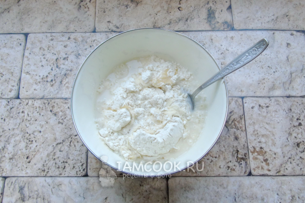 Налейте горячую воду, но не кипяток. Сначала тесто перемешивайте в миске ложкой.