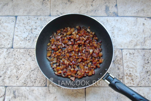 А тем временем сливу помойте, удалите косточку и мелко нарежьте. Выложите в сковороду и тушите 7-8 минут, перемешивая. У меня слива была очень сладкая, поэтому сахар я не добавляла. В кислую сливу стоит добавить сахар.