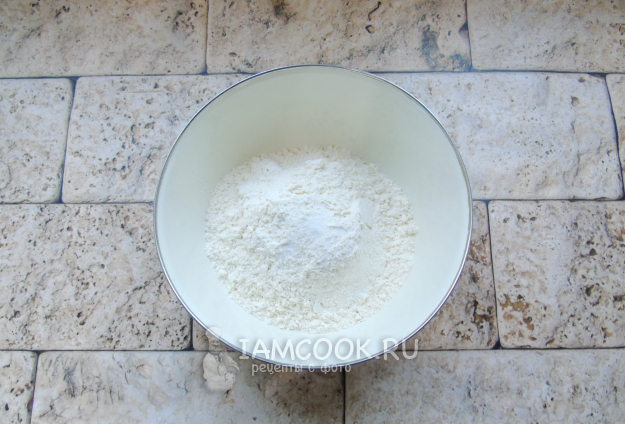 Замесите тесто для вареников. В миску насыпьте муку и соль.