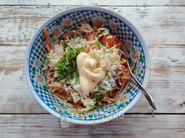 Соединить заготовки в глубокой миске, добавить заправку, специи по вкусу. Майонез можно использовать в равных частях со сметаной либо заменить сметаной, тогда салат получится еще полезнее и менее калорийным.