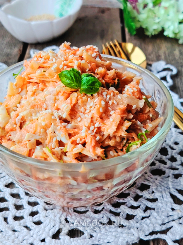 Перемешать салат, выложить в блюдо для подачи, посыпать кунжутом.