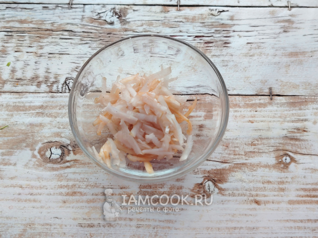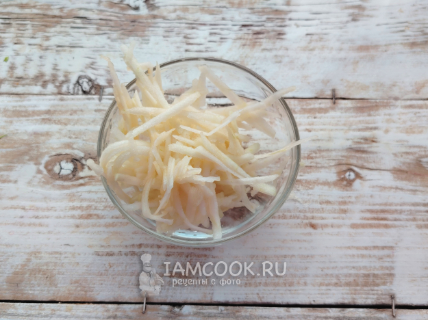 С яблока снять кожицу, мякоть натереть на терке, лучше также крупно, чтобы не выделилось слишком много яблочного сока, а стружка не превратилась в кашу.