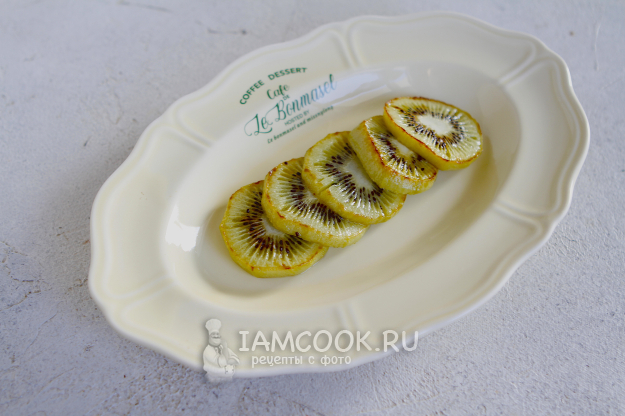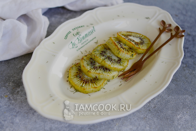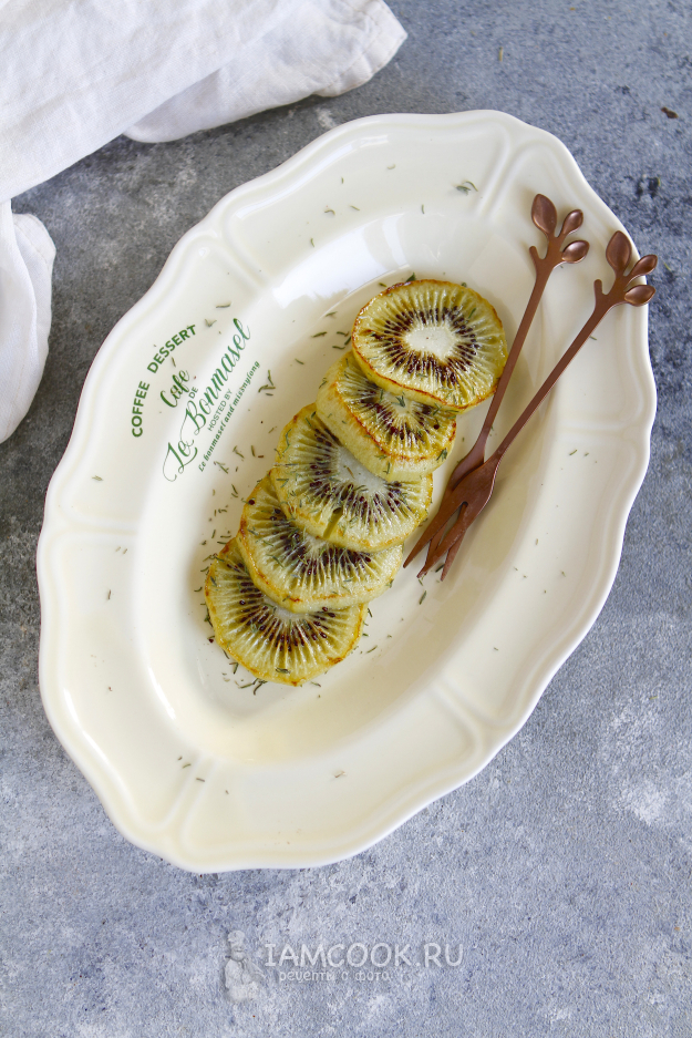 Затем вилкой или кулинарной лопатной аккуратно переверните киви и продолжите жарить с другой стороны еще примерно 4-5 минут.