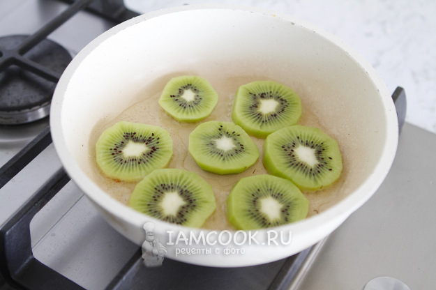 Как только сахар растает, выложите киви. Убавьте огонь и жарьте киви с одной стороны примерно 4-5 минут.
