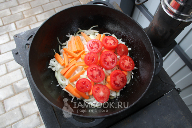 В идеале соков лука и других овощей должно хватить для тушения мяса и паров для овощей, но всё-таки советую в процессе аккуратно проверить. При необходимости подлейте горячей воды, но чтобы жидкости не получилось выше уровня мяса.