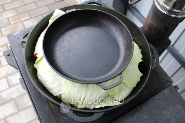 На листья капусты нужно положить что-нибудь для придавливания. Мне для этого пригодилась чугунная сковородка.