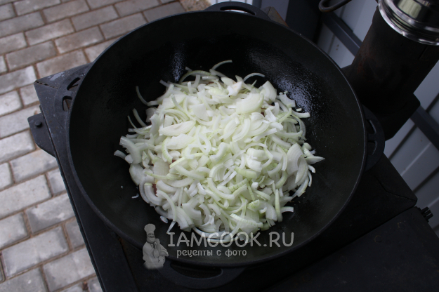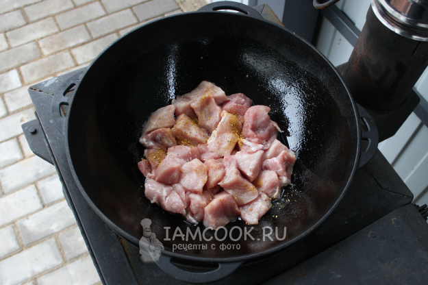 Мякоть свинины нарежьте на кусочки среднего размера (в случае говядины или баранины куски поменьше!). Холодный казан смажьте растительным маслом или жиром и уложите на его дно мясо, причем теми кусочками, которые с жирком, вниз. Посыпьте специями с зирой.