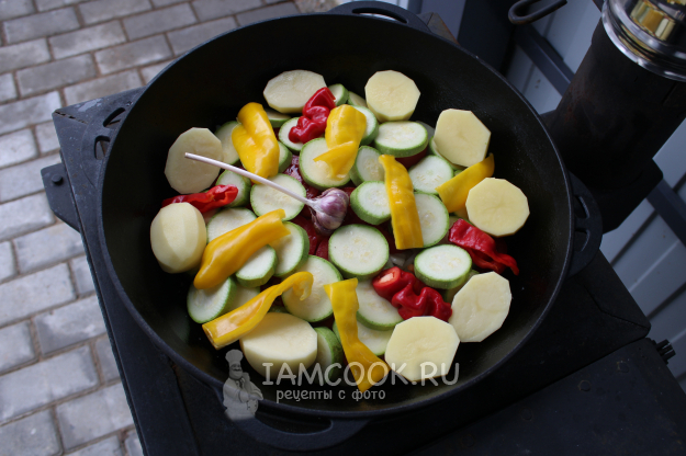 Теперь очередь нарезанного кабачка и сладких перцев, воткните головку чеснока. По периметру разложите в зависимости от размеров целые или половинки картофелин.