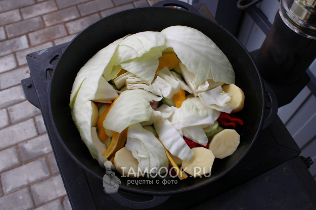 С капусты снимите несколько больших листьев - в таком количестве, чтобы ими укрыть всю поверхность будущей басмы. Остальную капусту нарежьте крупными кусками и добавьте поверх уложенных ранее овощей.