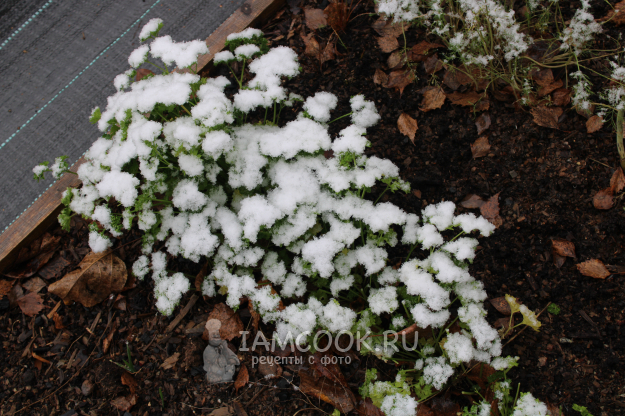 Свежая зелень – это на ваш вкус. В день приготовления, 2 ноября, я была в вятском крае, в огороде на грядке ещё имелась петрушка. Она спокойно перенесла легкий снежок и сгодилась для подачи к этой вкусной басме.