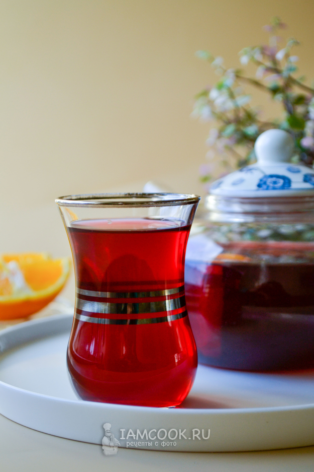 Настоянный чай каркаде с апельсином, корицей и имбирем имеет совершенной иной вкус и аромат, в отличие от горячего заваривания. Для большего охлаждения в бокал с холодным чаем можно положить кубики льда.
