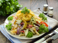 Для приготовления салата с отварной рыбой, картошкой и омлетом подготовьте ингредиенты по списку.