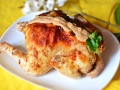 Запекать курицу 75-90 минут. Затем рукав для запекания разрезать и подрумянить курицу в течение 15 минут. Конечности курицы лучше прикрыть фольгой. При прокалывании курицы вилкой должен вытекать прозрачный сок.