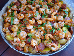 Креветки запеченные с чоризо, картофелем и кукурузой в приправе Old Bay