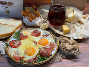 Яичница с колбасой и сыром